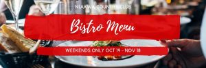 Enjoy a Bistro Style menu at your Club every Friday – Sunday, starting October 19 – 21.
