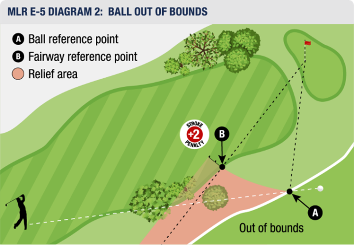 Rule E-5 is a Local Rule that we have implemented that allows for the player to drop a ball on the edge of the fairway (plus 2 club lengths), no nearer to the hole from the line where the ball last crossed the out of bounds line. This comes with a 2 stroke penalty. Therefore, in this situation, our guy will be hitting his 4th shot from where he dropped his ball from the edge of the fairway.