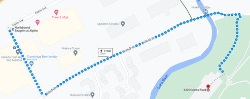 The below images show the described area in the FreshCo parking lot, along with a walking map to the club (using the pedestrian bridge over the Seine River).