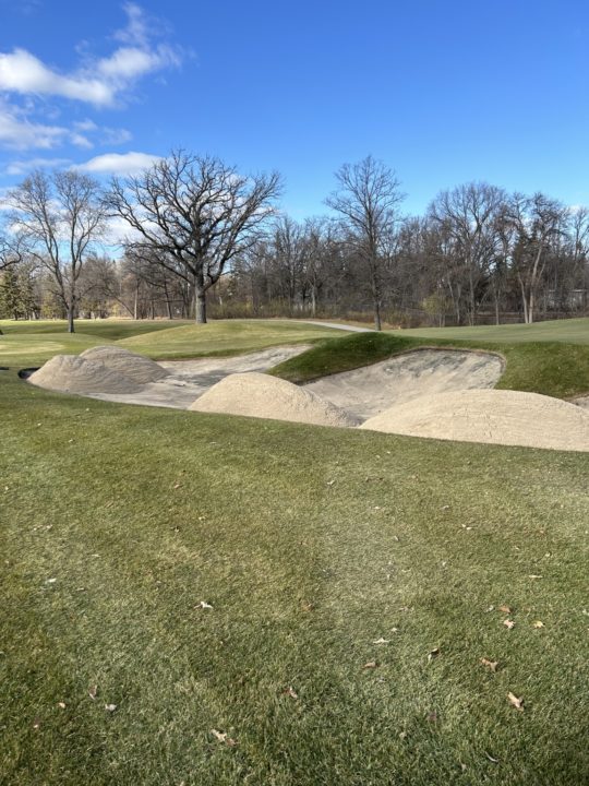 Bunker maintenance continues to progress this fall. We have begun to drop piles of sand in the green side bunkers on the back nine with the front nine having all sand placed. Excavation of all green side bunkers will be complete early this week and work has already begun on fairway bunkers with hole 1 being excavated. Once excavated the process includes ensuring that our drainage is functioning. Once this is confirmed and any repairs required completed, we tamp the floor of the bunker before installing sand. The forecast looks good to make additional strides with this program this week once the frost burns off the course each morning for work to continue.