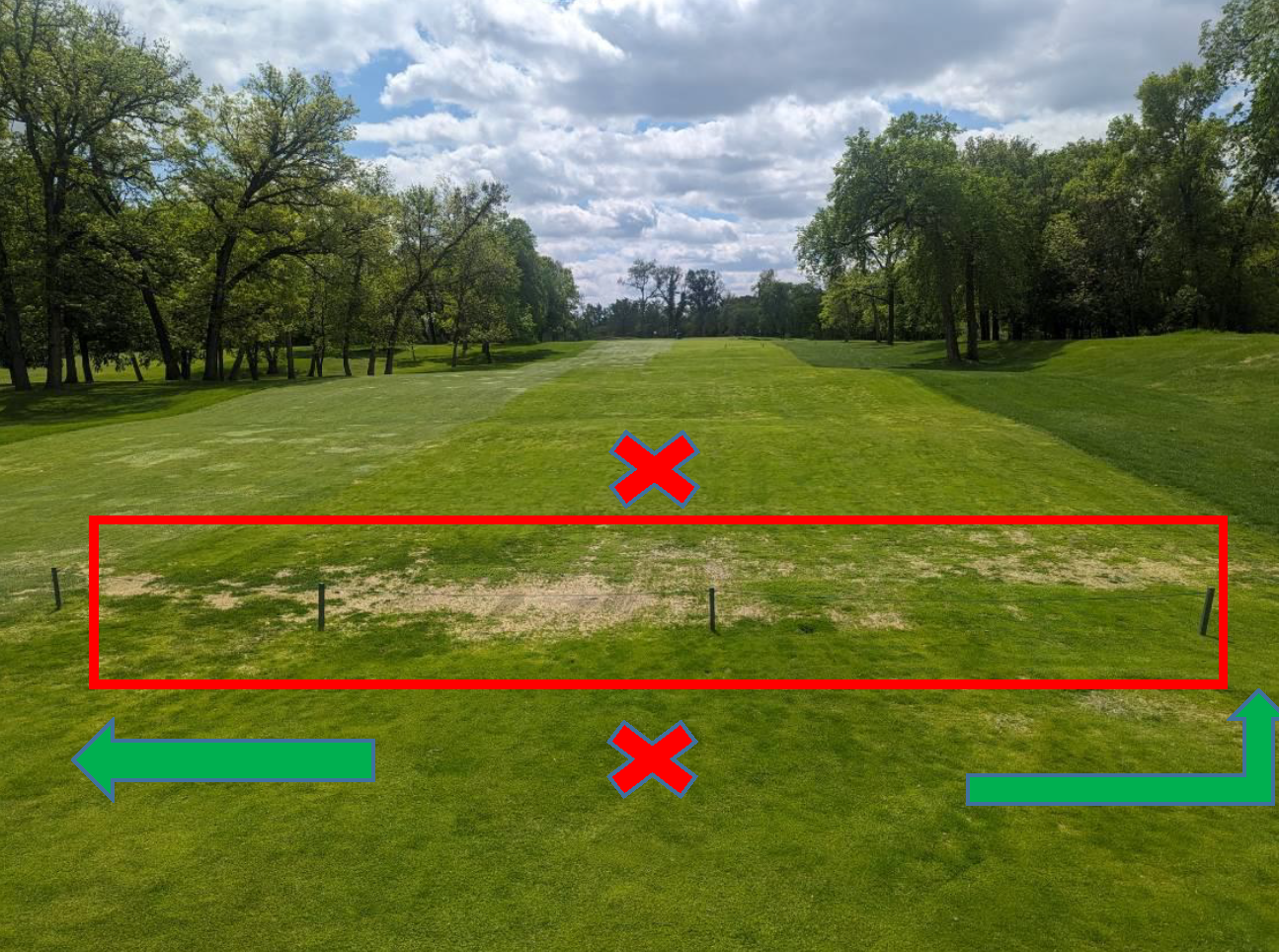 Figure 2 – These traffic control stakes and rope are preventing this damaged area from becoming worse due to power cart traffic. If you see these setups simply keep your power cart away from the area and travel around it. We would ask for no travel in the red “X” areas but follow the green arrow around the challenged location.