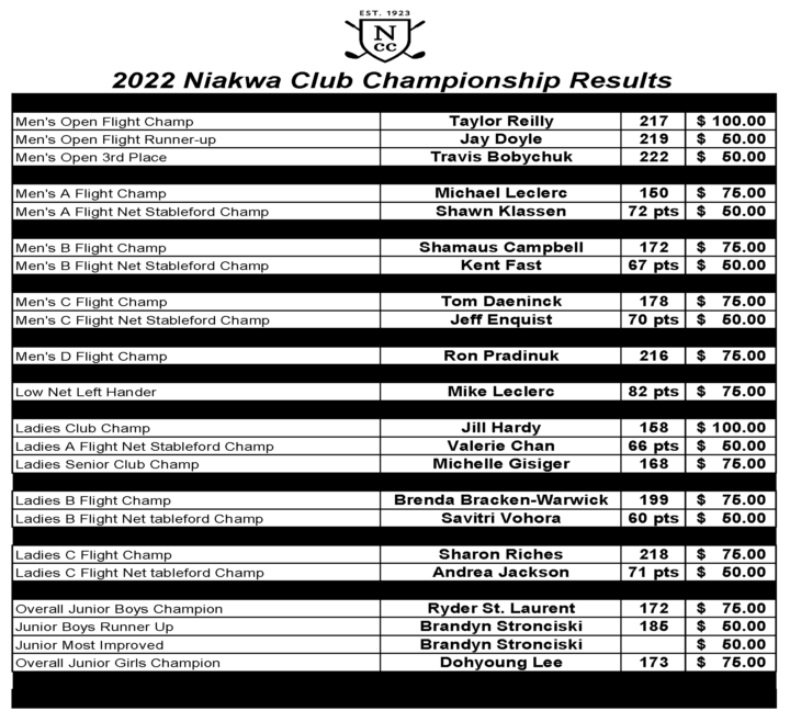 Congratulations to all our Niakwa members who competed in this past weeks Hodson Financial Golf Manitoba Senior Championship. Congratulations to Tammy Gibson finishing runner up in the Ladies Championship, Jay Doyle for also finishing runner up in the Men’s Championship, Ken Warwick for placing 4th in the Super Senior division and Nancy Porth for Winning the Net – Forward Tee Division.