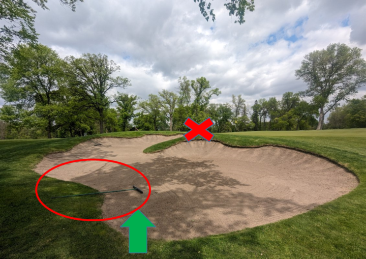 Figure 1 – See the placement of the rake above. We want the handle in the air on the perimeter of the bunker. The head of the rake in the bunker. When entering avoid the steep faces shown by the X above. Please enter from the low side where the green arrow is.