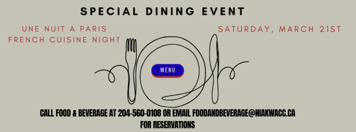 Reserve your table by reserving through the event calendar, calling Food & Beverage at 204-560-0108 or email foodandbeverage@niakwacc.ca